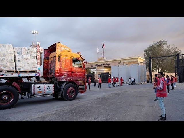 Egyptian Red Crescent Society vehicles loaded with supplies and mobile clinics are waiting at the border post to enter the enclave where the humanitarian situation remains dire.