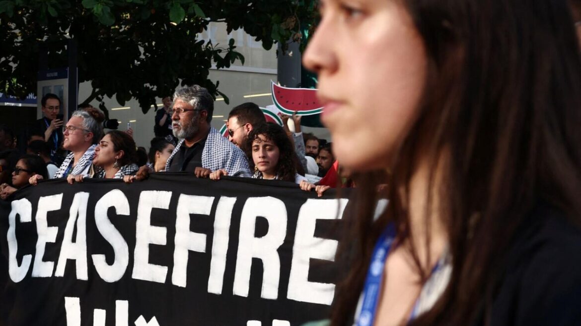 People hold a banner during a protest for a ceasefire in Gaza at COP28 in Dubai last December 9.
