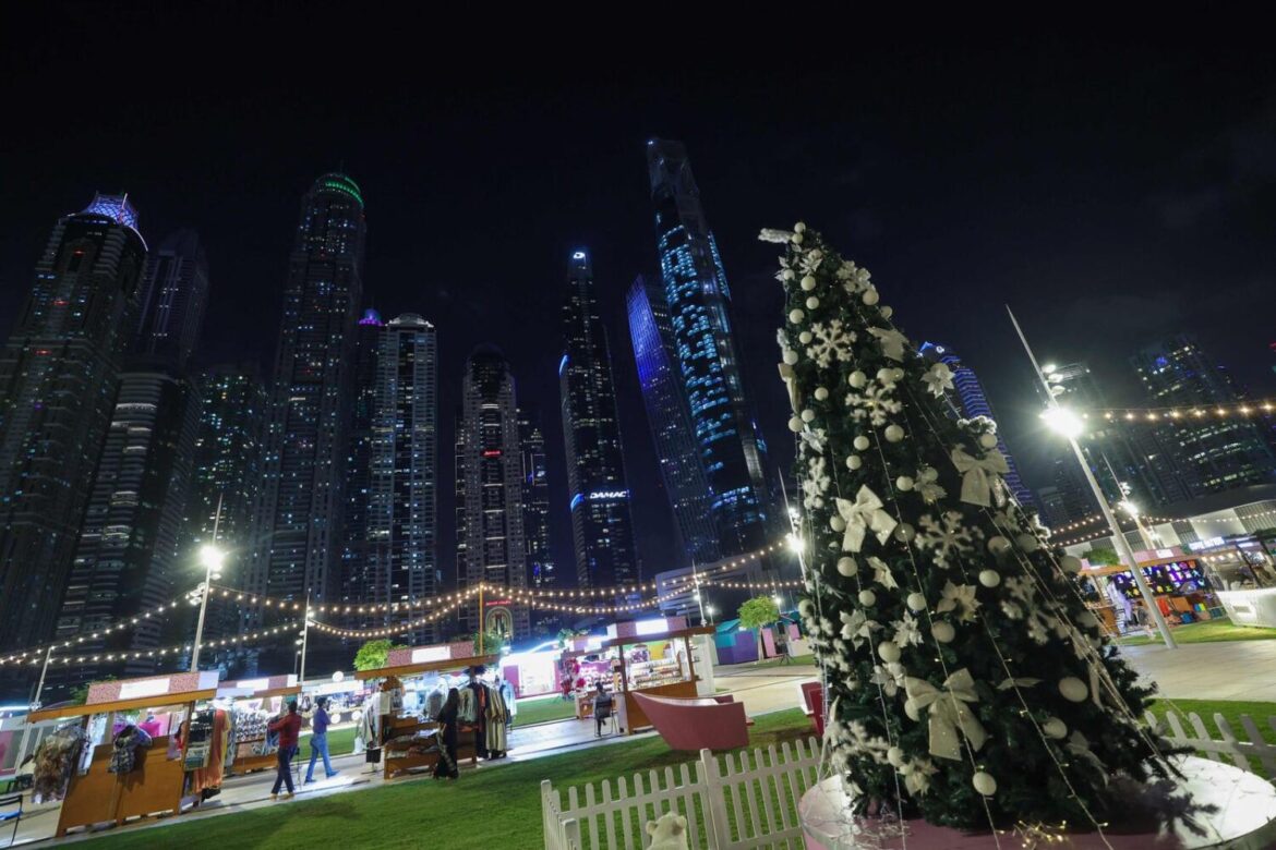 People take a stroll near a Christmas tree beneath the Dubai skyline on December 25, 2023.